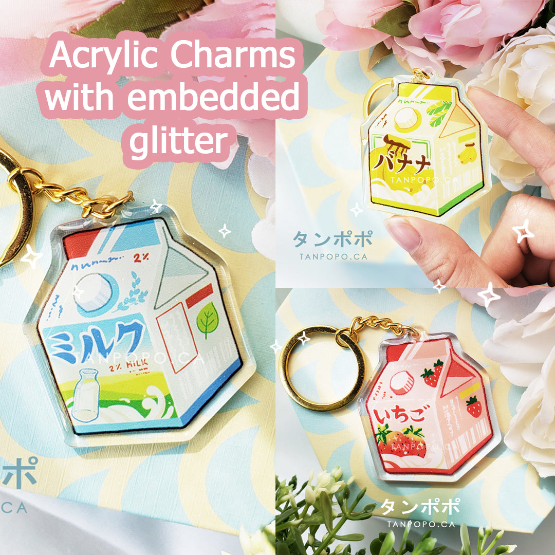 2-inch tall key chain charm made from durable acrylic with sparkles embedded in the material for extra cuteness and shine. Charm is printed double sided with an epoxy coating to give it a rounded edge and acts as an extra barrier to prevent chipping.